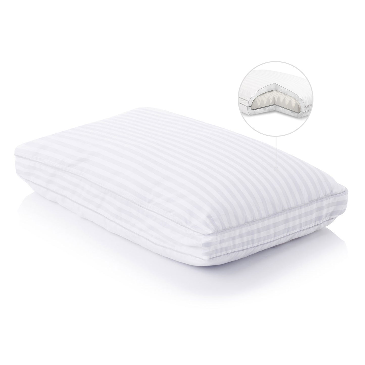 The Convolution® is crafted with the multi-position sleeper in mind and offers different levels of customizable support. A convoluted memory foam core encased in airy Gelled Microfiber® fill creates a soft, supportive sleeping surface, while the other side offers more support for side sleeping. Remove the core for an ultra-plush, luxurious down feel without odors, allergens, and sharp quills. A 300 thread count damask striped cover encases this pillow for added comfort.